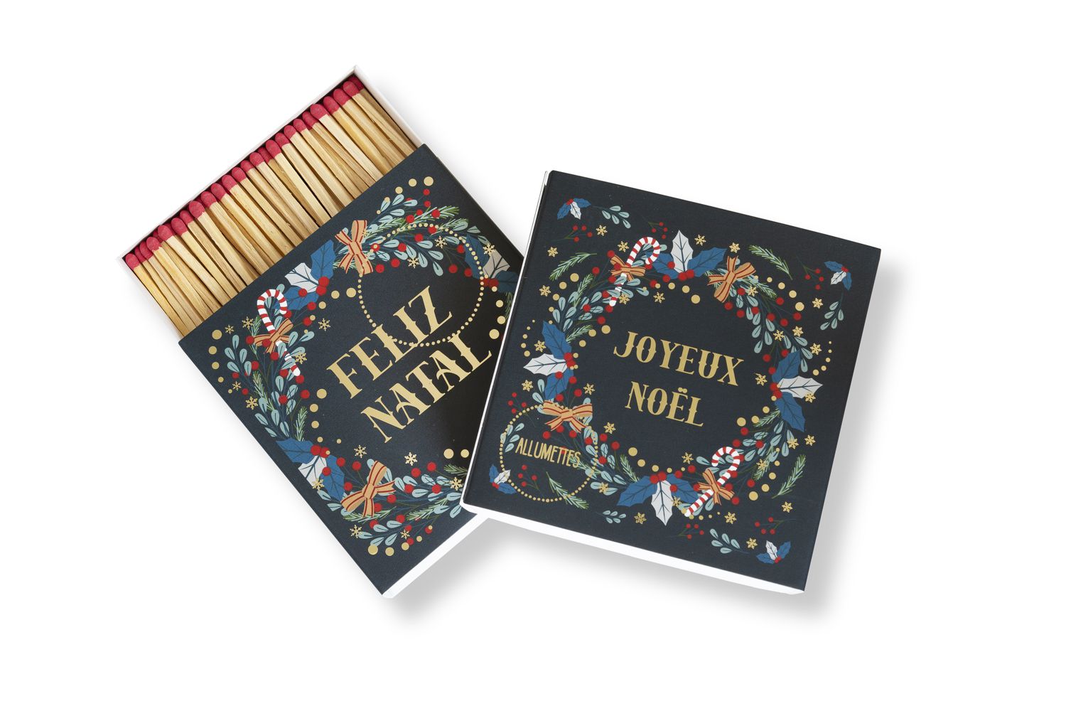 Em formato 11x11x3cm, contém 150 fósforos de segurança longos, vermelhos com 10cm de comprimento. Acabamento gold e ilustração exclusiva.