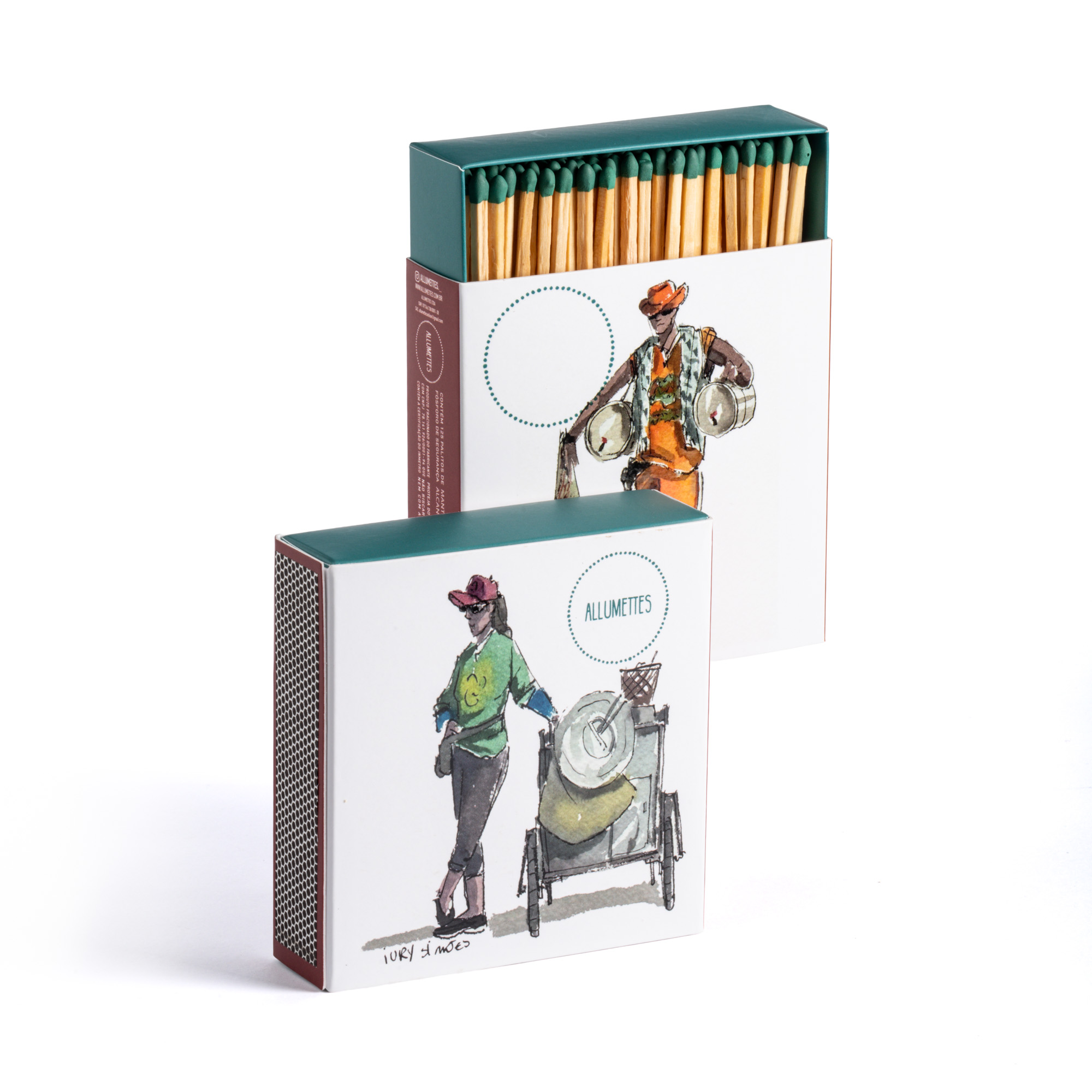 Em formato 11x11x3cm, contém 125 fósforos de segurança longos, verdes com 10cm de comprimento e ilustração exclusiva. Acabamento gloss.