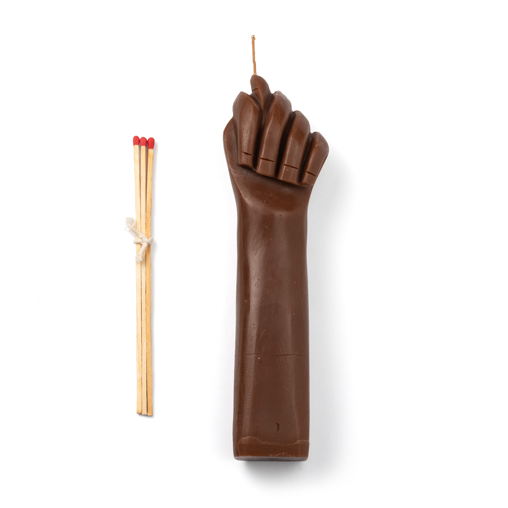 Vela em formato de figa em cera de mel, pavio 100% algodão + pin de metal Pavio Vintage. Medida 27 x 5,5 x 5 cm, acompanha 3 palitos de fósforos gigantes, coloridos, com 28cm de comprimento. Tempo de queima, aproximadamente 22 horas.